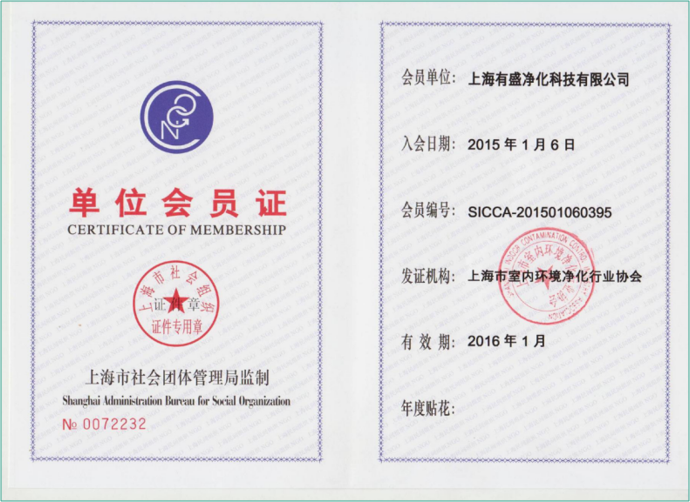 上海有盛凈化室內(nèi)環(huán)境凈化行業(yè)協(xié)會會員證書